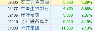 智通财经APP获悉,医药板块早盘悉数下跌,截至发稿,石四药(02005)跌5.29%,中国生物制药(01177)跌3.88%,绿叶制药(02186)、康哲药业(00867)均跌超2%。生物制剂服务供应商药明生物(02269)亦跌超3%。