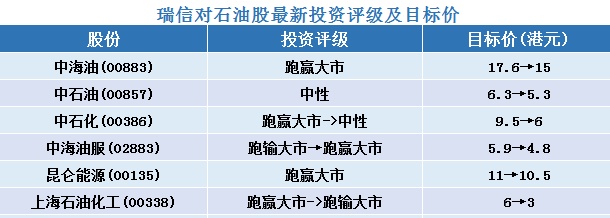 瑞信选股喜好顺序为中海油(00883)、中石油(00857)及中石化(00386),主要认为中海油成本控制最好,有力应对2019年的挑战,而中石油已接近估值底部,中石化虽被视为低油价下的避风港,但认为股价未反映化工需求减慢的影响,认为属2019年最大的风险,将其评级降至“中性”。