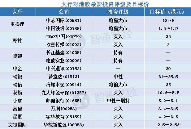 六、大行对港股最新投资评级及目标价汇总