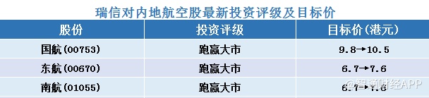 四、瑞信对内地航空股最新投资评级及目标价汇总