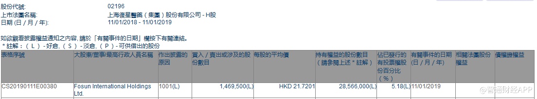 智通财经APP获悉,根据联交所资料显示,复星国际(00656)于2019年1月11日增持复星医药(02196)146万股,每股作价21.72港元,总值约3171.12万港元,最新持股量增至5.18%,最新持股数目2,856万股。