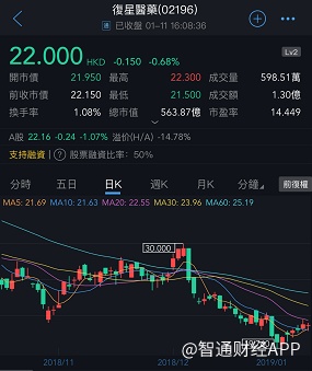 截至今日收盘,复星医药(02196)报22.00港元,跌0.68%。