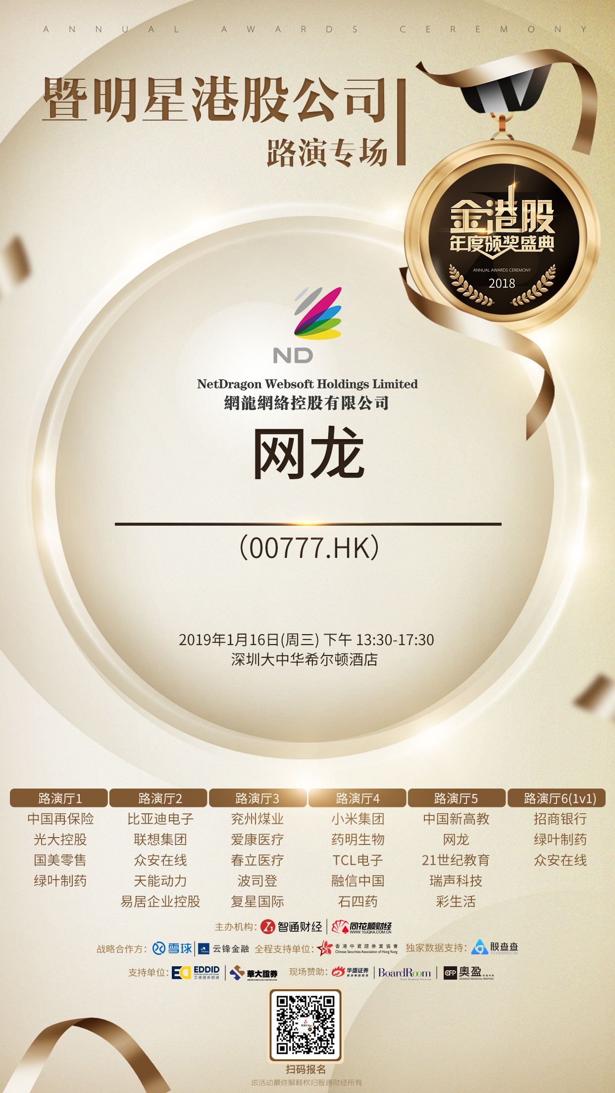 由国内领先的港美股资讯门户智通财经和同花顺财经共同主办,雪球、云锋金融协办,香港中资证券业协会全程支持,股查查独家数据支持,艾德证券、华大证券战略支持的“2018金港股年度颁奖盛典暨港股上市公司路演”活动将于2019年1月16日在深圳举行,欢迎投资者报名参加。