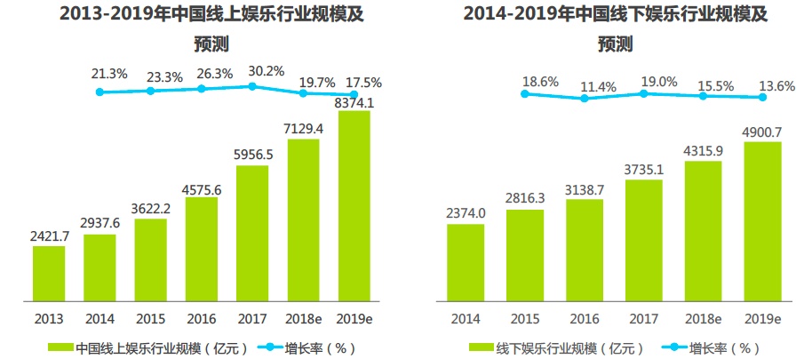 在好时光娱乐街区火爆的背后,是线下娱乐市场的崛起。据艾瑞咨询《中国新生代线下娱乐消费升级研究报告》数据,虽然线下娱乐行业规模的增长率未能像线上一样达到20%,但也将增长率保持着15%上下。在新生代崛起的推动下,2019年总体市场规模有望达到4900亿元。