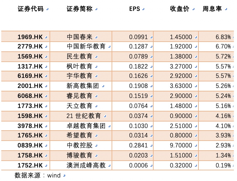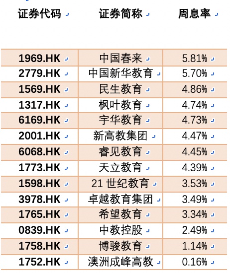 一旦停止外延式并购,公司层面就不需要积累现金,可以完全以股息的形式派发出来。按照教育类公司12月份普遍公布的年报数据,目前的周息率见下表: