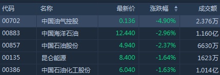 智通财经APP获悉,上周五纽约期油收跌1.7%,全个星期周急升7.8%,连涨两周。受国际油价走势影响,港股“三桶油”集体下挫,截至10时20分,中海油(00883)跌2.96%,报价12.44港元,中石油(00857)跌2.37%,中石化(00386)跌1.63%。