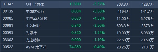 智通财经APP获悉,芯片股早盘普跌,截至发稿,华虹半导体(01347)跌5.57%领跌芯片股,中国软实力(00139)跌5.56%,中电华大科技(00085)跌4.55%,中芯国际(00981)跌3.5%。