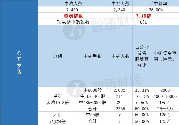 其中,公开配售申购人数7430人,一手中签率25%,认购倍数7.15倍。