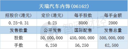 智通财经APP获悉,1月14日,天瑞汽车内饰(06162)配售结束。配售招股价0.25港元,每手2000港元。