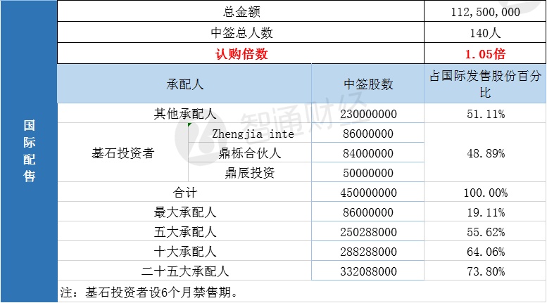 国际配售中签总人数140人,认购倍数为1.05倍。