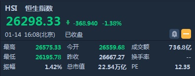 智通财经APP获悉,恒指早盘低开0.4%,报26559.68点。截至收盘,恒生指数跌368.94点或1.38%,报26298.33点,全日成交额达736.8亿。国企指数跌1.55%,报10292.44点,红筹指数跌1.04%,报4230.47点。