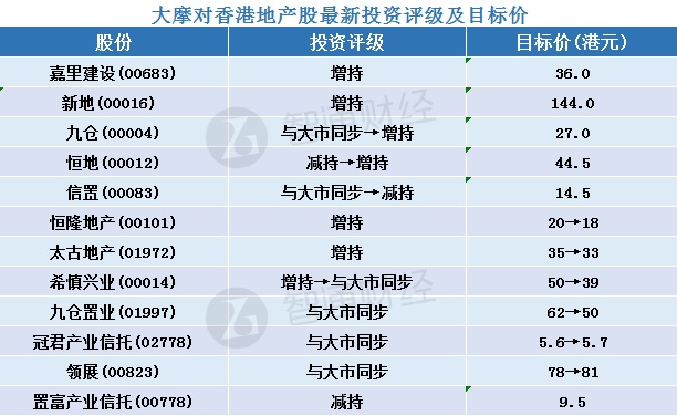一、大摩对香港地产股最新投资评级及目标价汇总
