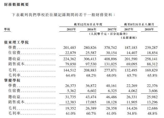 该集团旗下的广东理工学院截至2018年收益为2.5亿元,毛利为1.6亿元,毛利率为65.8%;肇庆学校总收益为2598.2万元,毛利为1268.6万元,毛利率为48.8%。由于业务扩充,两所学校均取得收益增长。