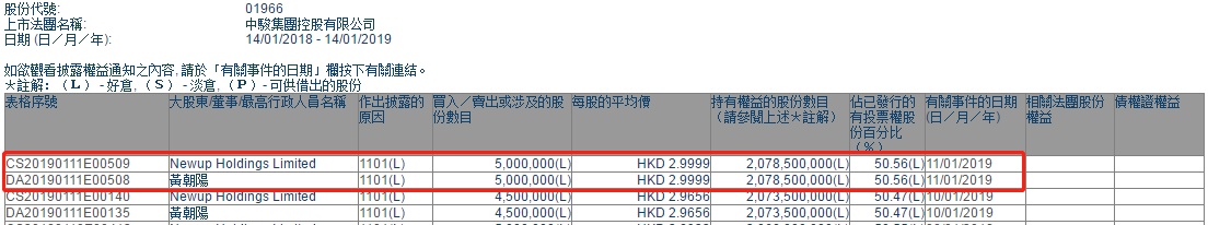 智通财经APP获悉,根据联交所资料显示,中骏集团控股(01966)于1月11日获Newup Holdings Ltd增持500万股,每股作价2.9999港元,总值1499.95万港元,最新持股数目约20.78亿股,持股比例增至50.56%。