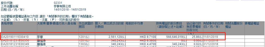 智通财经APP获悉,根据联交所资料显示,李宁(02331)于1月11日被李宁减持256万股,每股作价8.71港元,总值2229.76万港元,最新持股数目约5.66亿股,持股比例减至25.86%。