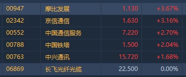 智通财经APP获悉,早盘5G概念股普涨,截至发稿,摩比发展(00947)涨3.67%,京信通信(02342)涨3.16%,中国通信服务(00552)涨2.7%,中国铁塔(00788)涨2.04%,中兴通讯(00763)涨1.68%。