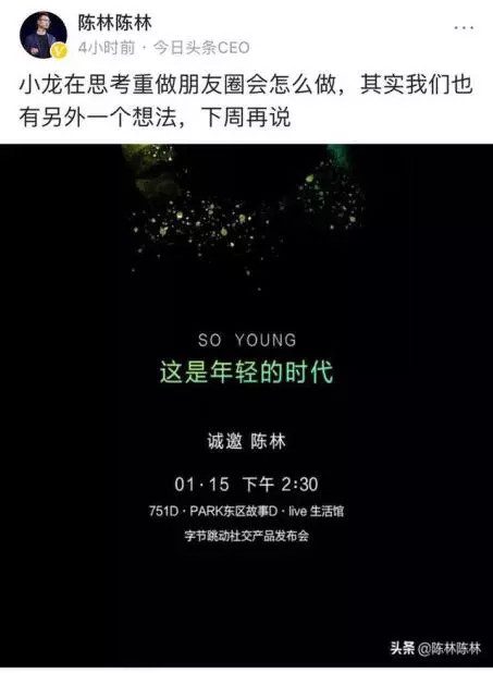 这一观点似乎与陈林的想法不谋而合,且获得了陈林的点赞。此后不久,陈林于今日头条上发出了字节跳动社交产品发布会邀请函,同时配文:“小龙在思考重做朋友圈会怎么做,其实 我们有另外一个想法”。