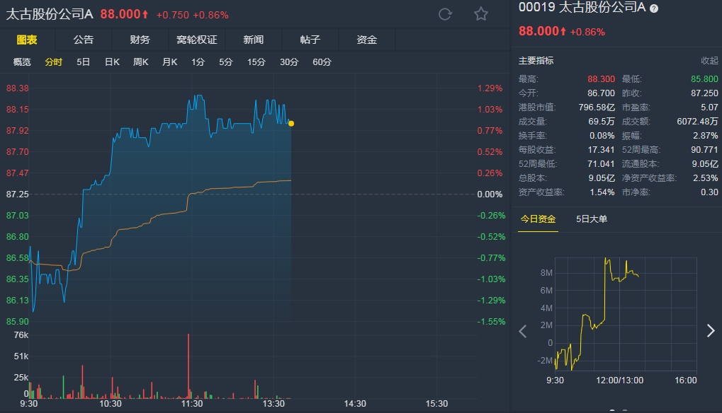 该行称,太古是2018年表现最好的企业之一,股价升14%,同期恒指则跌14%。该行对太古今年前景看法乐观,预计盈利反弹,股份有机会获重新评估,及资产净值折让收窄,该行上调集团2018-20年盈测8%至29%,目标价升23.5%至123.45港元,重申评级“跑赢大市”。
