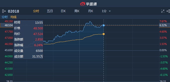 智通财经APP获悉,瑞声科技(02018)午后一度升逾7%,截至13时54分,涨6.35%,报价48.55港元,成交额3.145亿。在过去6个交易日里,瑞声科技有5个交易日均实现上涨,累计涨幅近两成。