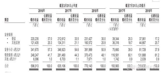 截至2016年、2017年、2018年3月31日止年度,首沣控股收入分别为5.96亿、6.35亿、77亿港元。其中,宴会服务收入占比逐年减小,餐饮服务收入占比逐年升高。2018年,婚宴服务收入占比30%,其他宴会服务收入占比20.9%,餐饮服务收入占比48.1%。期内溢利分别为3987.4万、4026.9万及5298.2万。
