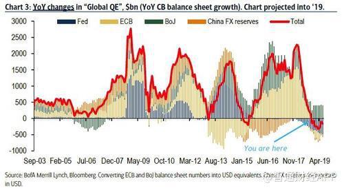 上述图表证实,全球经济的关键点并不是美联储是否停止加息或开始降息,而是美联储和其他各国央行如何处置其资产负债,是否暂时暂停紧缩资产负债表后,再次向市场注入流动性。