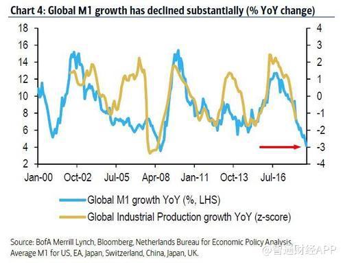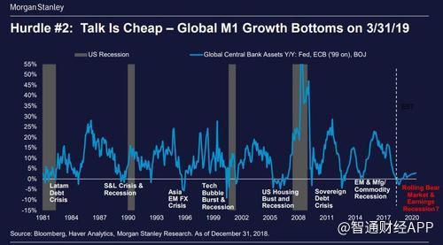 摩根士丹利展示了以下图表,以证明货币增长率过低可能是全球经济面临的最大问题。该图表显示出了每次狭义货币(M1)下降为负值时都会出现金融危机,如2015年新兴市场制造业商品衰退、2011年主权债务危机、2007/2008年全球金融危机和美国房地产泡沫破裂、2000年科技泡沫破裂等。