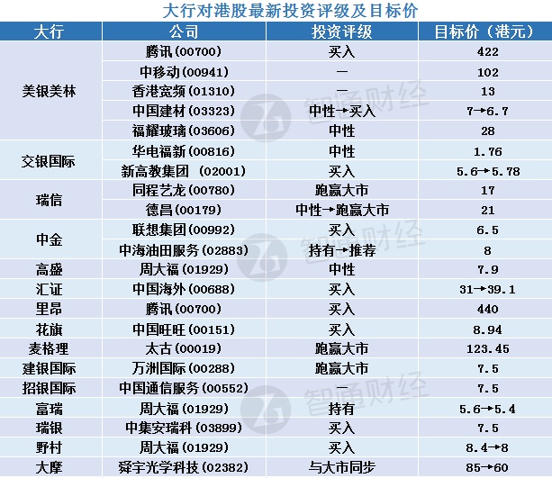 三、大行对港股最新投资评级及目标价汇总