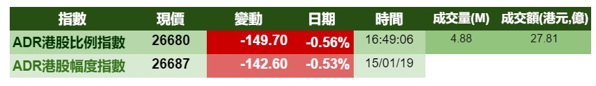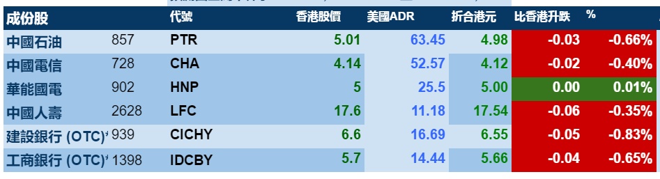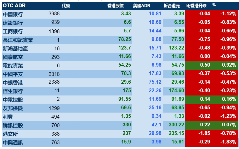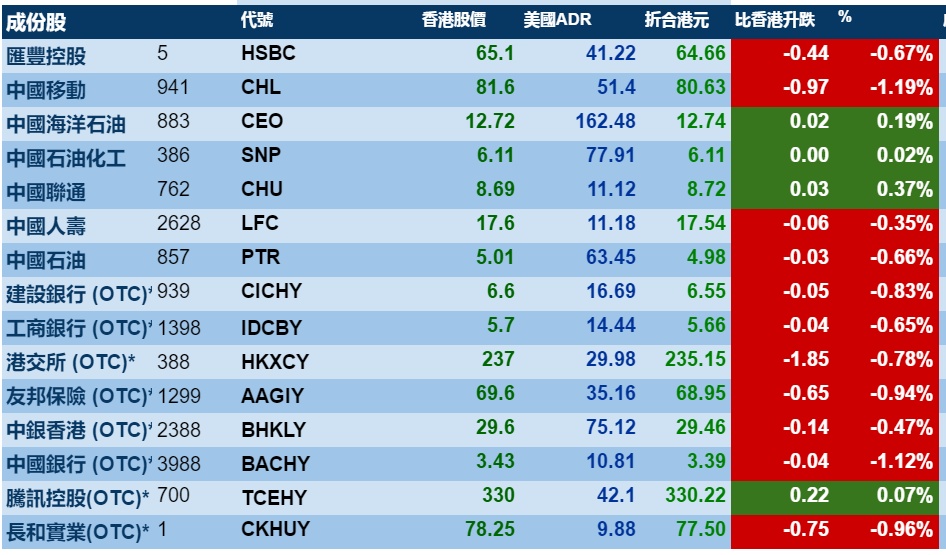 智通财经APP获悉,周二港股ADR指数全日偏软,按比例计算,收报26680点,跌149.7点。大型蓝筹多数收跌,汇丰控股收报64.66港元,较港收市跌0.44港元;腾讯控股收报330.22港元,较港收市升0.22港元。