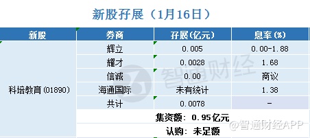 智通财经APP获悉,科培教育(01890)正在招股中,截至1月16日,辉立、耀才等券商分别为其借出0.005亿和0.0028亿元孖展金。目标集资额为0.95亿元,孖展未足额。