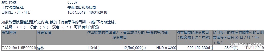 智通财经APP获悉,联交所股权变动资料显示,罗林于1月11日增持安东油田服务1250万股,每股作价0.82港元,总值约1025万港元,最新持股数目约6.92亿股,最新持股比例增至23.04%。