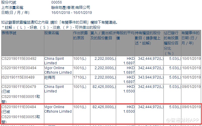 智通财经APP获悉,联交所股权变动资料显示,Vigor Online Offshore Ltd于1月9日及10日合共增持联合地产(香港)(00056)8242万股。每股作价约1.65港元,总值约1.36亿港元,最新持股数目约3.42亿股,持股比例升至5.03%。