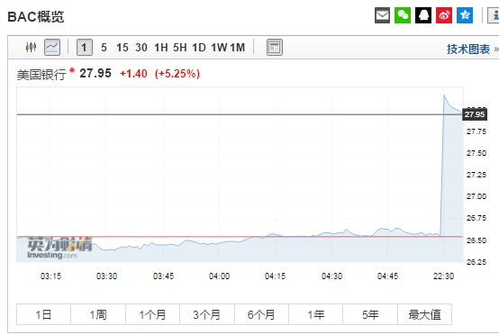 财报公布后,美国银行(BAC.US)周三开盘报28.13美元,涨1.58美元,涨5.8%。截至发稿,报27.95美元,涨幅5.25%。