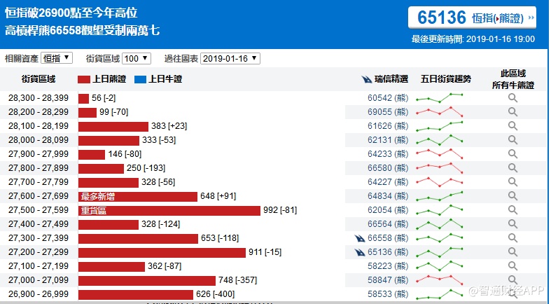 智通财经APP获悉,截至1月17日,恒指最新的牛熊街货比例50:50。从瑞信恒指牛熊证街货分布图中得到的数据显示,熊证街货重货区在27500-27599区间,该区间最新熊证数量为992张,减少81张,最多新增在27600-27699区间。牛证街货重货区在25800-25899区间,该区间最新牛证数量为1018张,比上一交易日增加33张,最多新增区间在26500-26599区间。