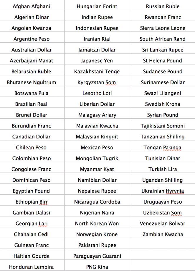 在这72种货币中,不包括英镑、瑞士法郎、欧元和人民币。但是,也并不全是很边缘的货币,只不过以美元等主流货币计的黄金价格显得更低一些。