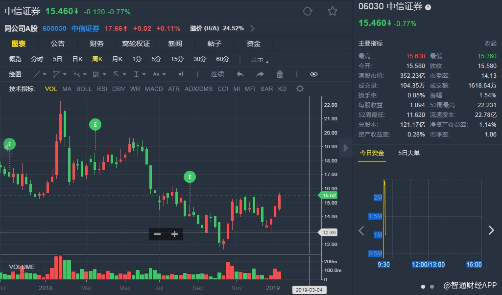 智通财经APP获悉,招银国际表示,中信证券(06030)的A股去年跌25%,本年至今由低位反弹逾半成,上证综指昨日升穿中期下降轨,有利券商股气氛。中信证券上周公布,向越秀金融控股收购广州证券100%股权,中信证券将向卖方发行7.9亿股A