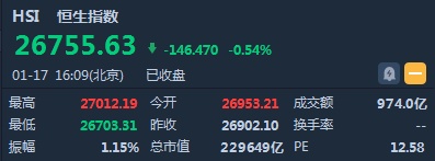 智通财经APP获悉,恒指早盘高开0.19%,报26953.21点。盘中一度重上两万七关口,午后走弱。截至收盘,恒生指数跌146.47或0.54%,报26755.63点,全日成交额达974.03亿。国企指数跌0.41%,报10512.15点,红筹指数跌1.16%,报4287点。