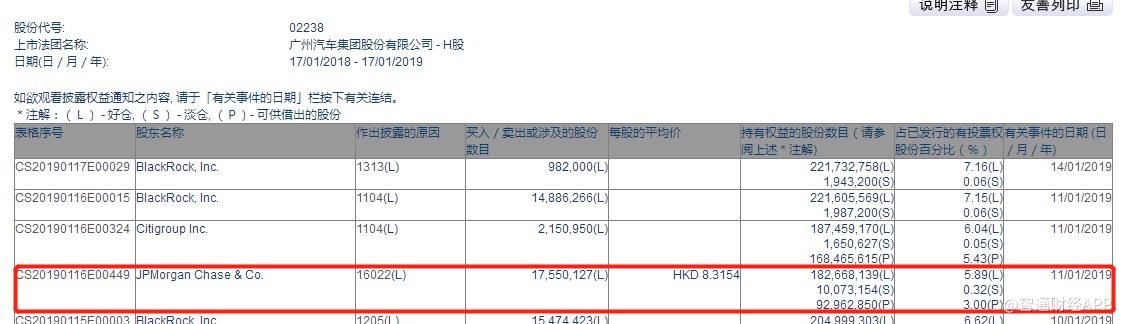 智通财经APP获悉,根据联交所资料显示,广汽集团(02238)于1月11日被摩根大通减持1755万股,每股作价8.3154港元,总值1.46亿港元,最新持股数目约1.82亿股,持股比例降至5.89%。