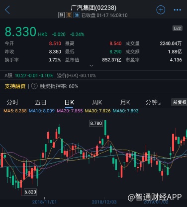 截至今日收盘,广汽集团跌0.24%,报8.33港元。