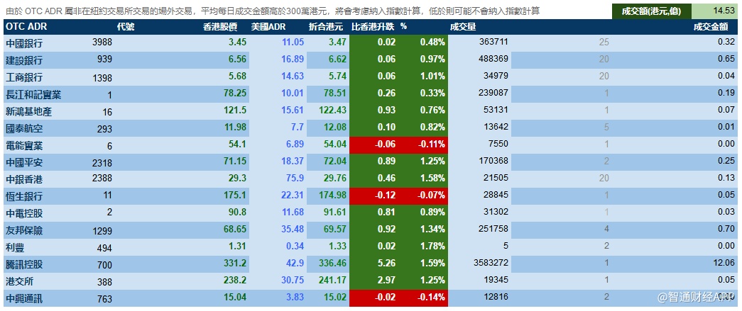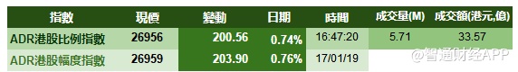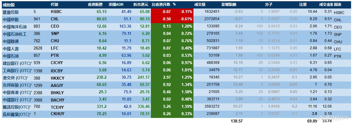 智通财经APP获悉,隔夜港股ADR指数全日走强,按比例计算,收报26956点,升200.56点。大型蓝筹走势不一,汇丰控股收报65.08港元,较港收市跌0.07港元;腾讯控股收报336.46港元,较港收市升5.26港元。