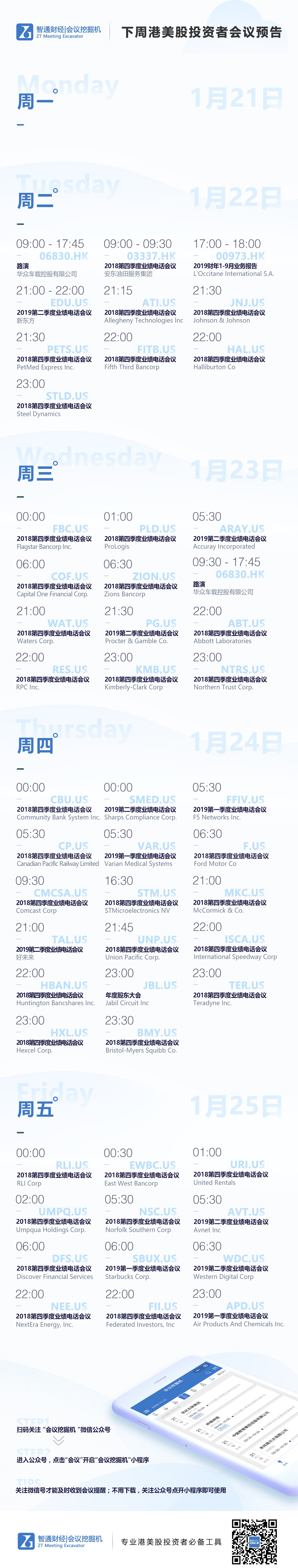 以下是智通财经“会议挖掘机”为您整理的下周(1月21日-1月25日 )港美股上市公司会议日历。