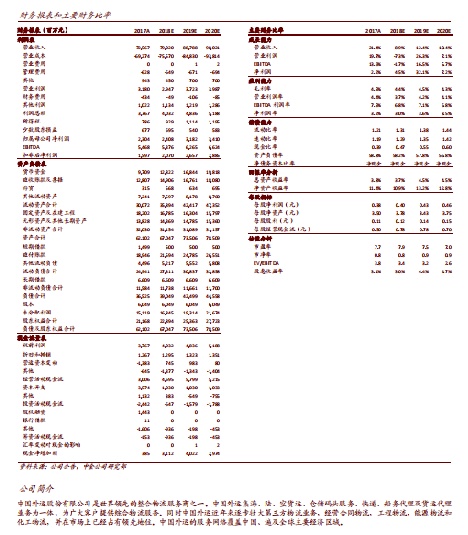 中国外运是中国领先的物流公司,全球第三大货运代理平台1和全球第七大第三方物流服务供应商2,主要提供货运代理(包括海运代理、船舶代理、空运代理)、合同物流、国际快递三大业务。2017 年中国外运的母公司中外运长航集团整体并入招商局集团,中国外运成为招商局集团的物流业务统一运营平台,发挥规模效应与传统优势,以强大的货代物流业务为基础,大力发展现代物流业,提高综合物流服务水平。