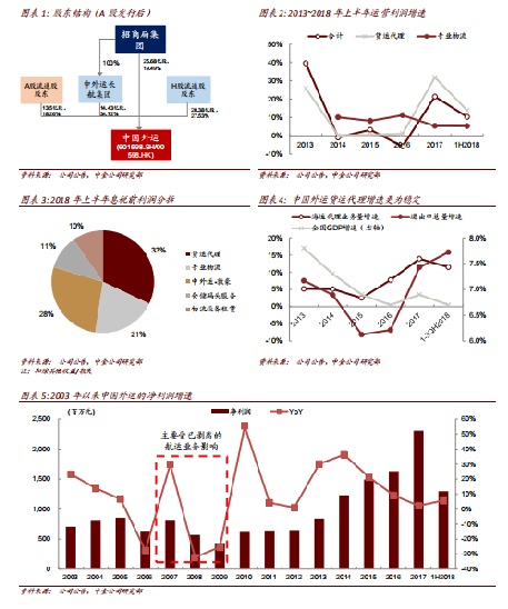 货代、物流业务增长稳健。公司2009 年以来保持净利润逐年增长,2013-2017 年经营利润复合年增长率达到10%。向前看:1)专业物流板块整合完成,与招商物流的协同效应有望于明年开始释放。2)货运代理业务近五年市场份额与毛利率均实现提升,或将通过提高直接客户比例、增加物流服务环节、加强区域整合方式,推动毛利润率继续提升。