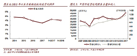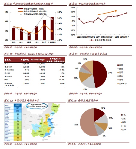业务量(图表7、8):除2009 年外,过去十年业务量持续增长,复合年增速达7.2%。业务量和价格均影响收入。虽然价格有所波动,收入仍保持稳定并实现6.2%的复合年增速。过去五年市场份额不断增加,从2013 年的4.6%增至2018 年前三季度的5.0%。盈利能力(图表9):货运代理板块利润率低于专业物流,但该板块利润率在过去几年逐渐提高(从2010 年的1.4%增至2017 年的2.4%,并在2018 年上半年进一步增至2.9%),主要由于直接客户占比增加以及成本下降。我们认为货运代理利润率有望继续提升。