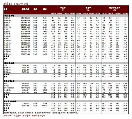 而A 股估值低于可比同业,建议关注中外运-A。中国外运A 股参考开盘价为 A 股换股价5.24 元/股,对应12 倍2019 年市盈率,相比较A 股物流公司的平均市盈率16.4 倍低30%左右,建议关注。