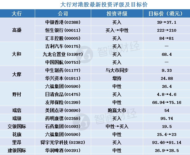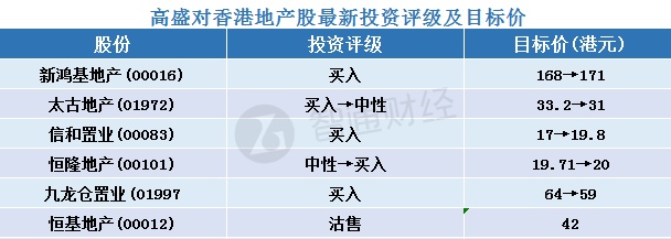 二、高盛对香港地产股最新投资评级及目标价汇总