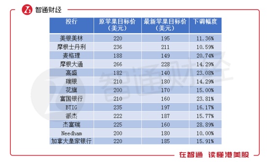 智通财经APP了解到,自下调收入预期后,华尔街多家投行也纷纷对苹果目标价进行了下调。其中,富国银行下调幅度达23.81%,高盛给出最低目标价140美元。