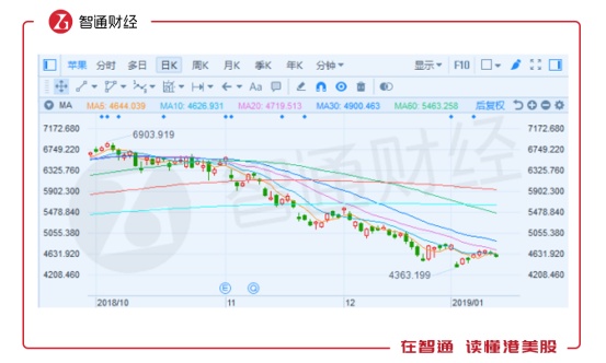 伴随目标价下跌的,是苹果市值的调整。2019年1月3日仅一日内,苹果股价收跌9.96%,单日市值蒸发746.45亿美元,创6年来最大单日跌幅。市值自去年8月突破万亿美元的两个月后,苹果股价经历一路下跌,由王位跌落至第四名,市值蒸发近4000亿美元。截至1月14日收盘,苹果股价收报150,跌1.5%。