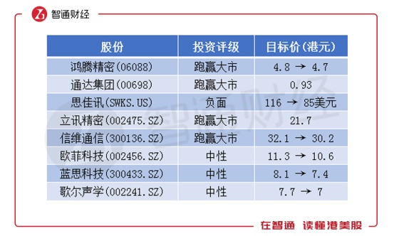 在苹果产业链中,苹果供应商同样也遭受了目标价下调的境遇。产业链相关股也遭到机构下调了目标价。其中,花旗将苹果半导体组建供应商思佳讯(SWKS.US)评级由“买入”下调至“负面”。Cowen也下调了凌云半导体(CRUS.US)和博通(AVGO.US)2018年的营收预期。