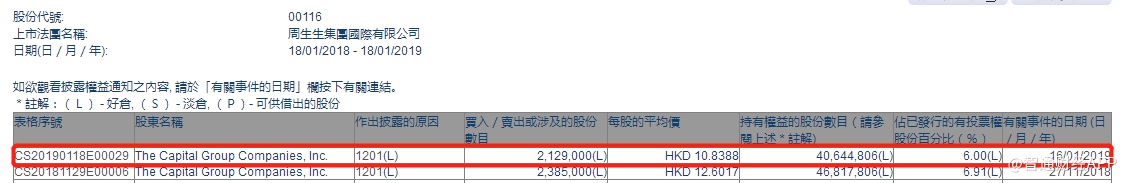 智通财经APP获悉,联交所股权变动资料显示,The Capital Group于1月16日减持周生生(00116)212万股,每股作价10.84港元,总值约2298.08万港元,最新持股数目4064万股,最新持股比例降至6.00%。