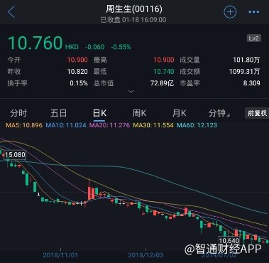 截至今日收盘,周生生(00116)跌0.55%,报10.76港元。